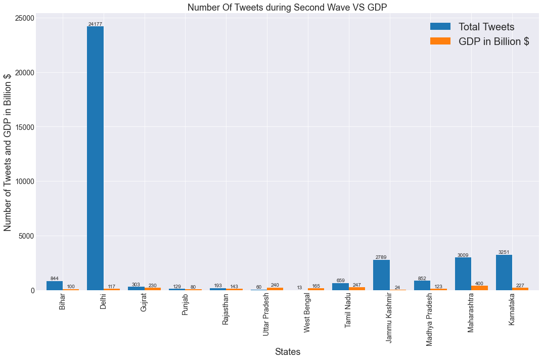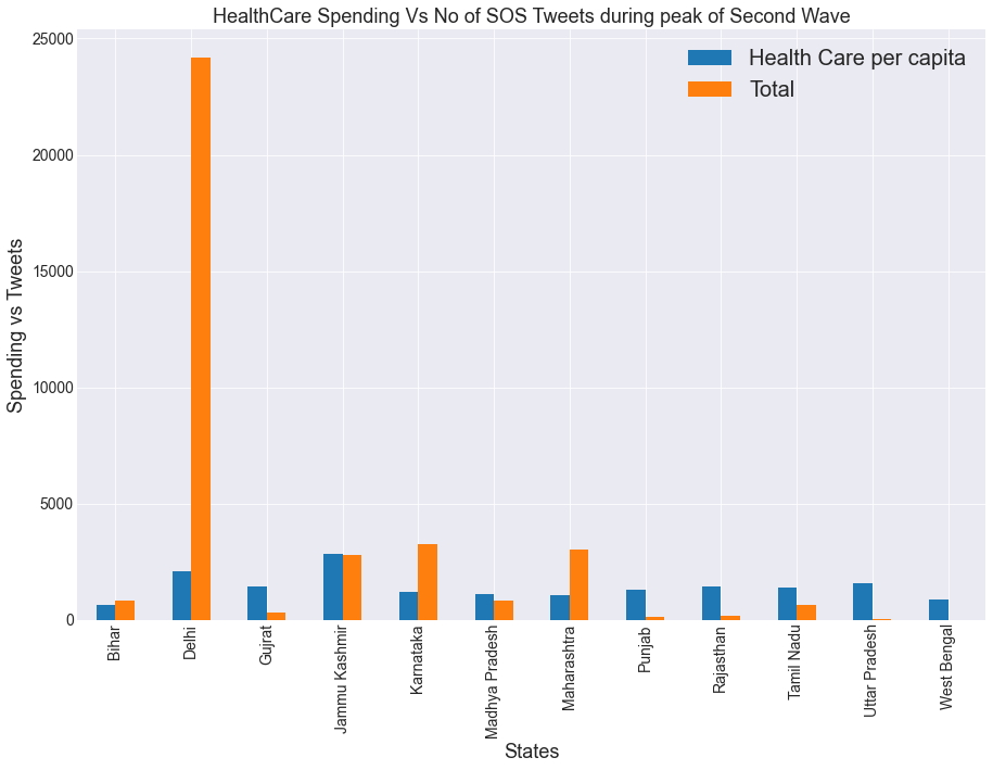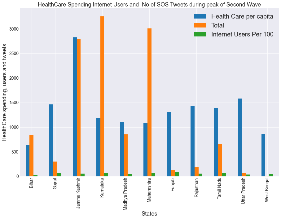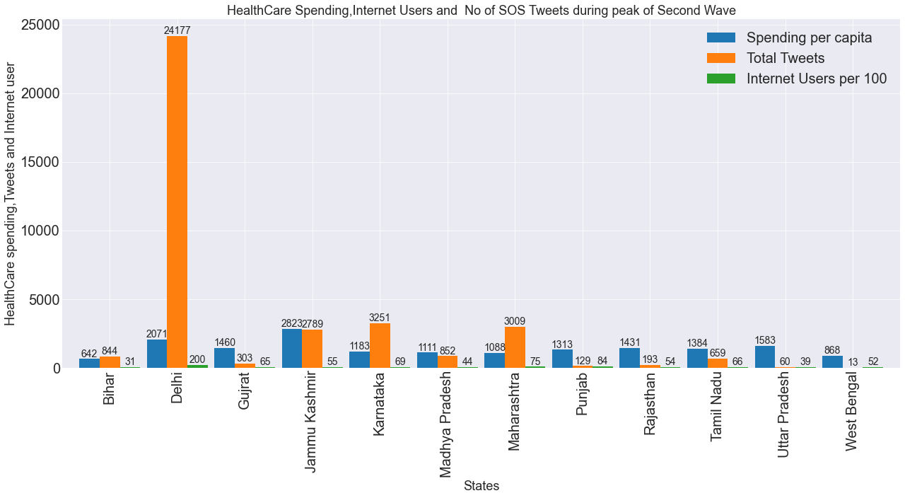# plt.title('HealthCare Spending,Internet Users and No of SOS Tweets during peak of Second Wave',fontsize=18 )